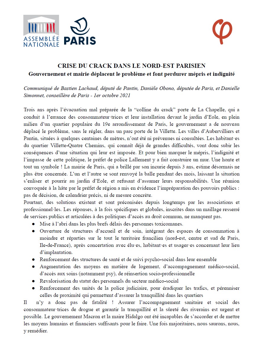 Communiqué de Bastien Lachaud, député de Pantin, Danièle Obono, députée de Paris, et Danielle Simonnet, conseillère de Paris – 1er octobre 2021
