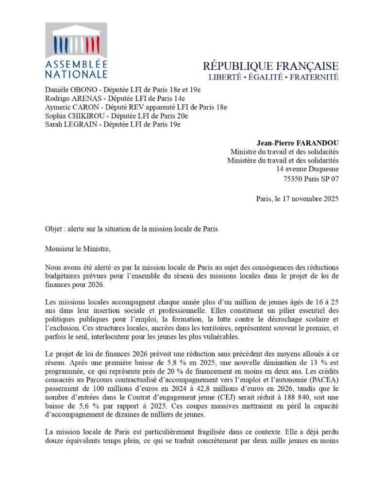 Nous avons été alerté·es par la mission locale de Paris au sujet des conséquences des réductions budgétaires prévues pour l’ensemble du réseau des missions locales dans le projet de loi de finances pour 2026.