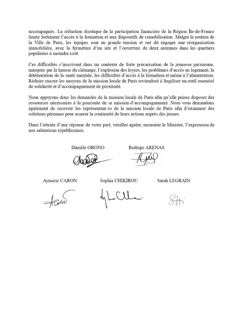 Nous appuyons donc les demandes de la mission locale de Paris afin qu’elle puisse disposer des ressources nécessaires à la poursuite de sa mission d’accompagnement. Nous vous demandons également de recevoir les représentant·es de la mission locale de Paris afin d’examiner des solutions pérennes pour assurer la continuité de leurs actions auprès des jeunes.